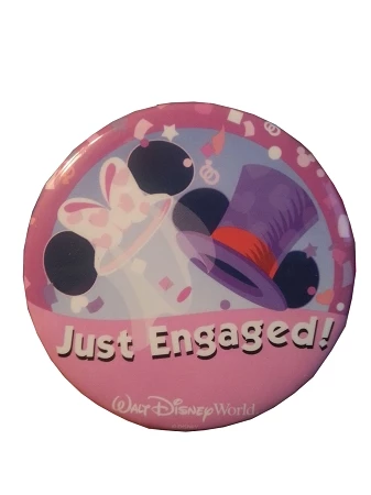 This Disney Souvenir Button is a wonderful way to show off your engagement. Features a image of bride and groom ear hats with “Just Engaged” underneath, as well as the Walt Disney World Logo.
